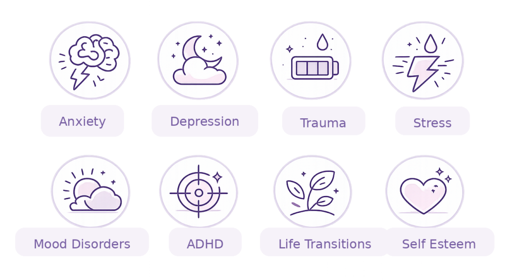 Support for anxiety, trauma related symptoms, burnout, mood concerns, and life transitions.